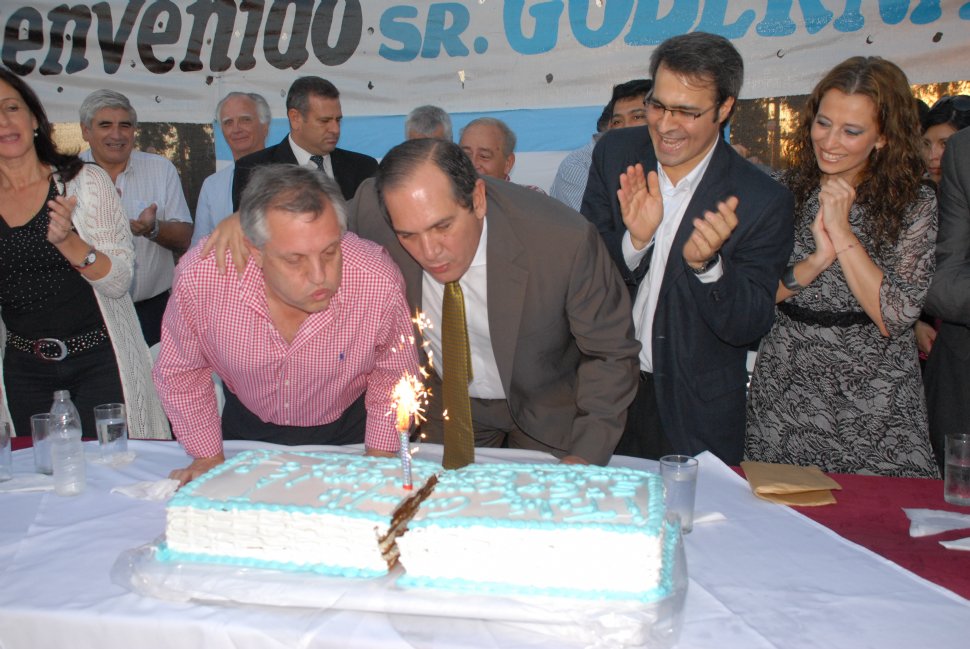 "POR CALMA EN LA CAMPAÑA ELECTORAL". En Taco Ralo, Alperovich sopló la velita junto al ministro Gassenbauer, que también cumplió años ayer. SECRETARIA DE PRENSA Y DIFUSION