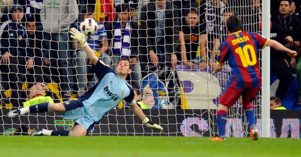 El Barcelona iba a tocar la pelota y el Real, a esperar. La estrategia azulgrana era clara también: riesgo cero en el pase para evitar los contragolpes. Pepe acosaba y Messi bajaba mucho para entrar en contacto con la pelota. Los blancos desconectaron de principio al Barcelona. Pero la posesión del esférico era azulgrana. Nadie se la discutía. Tras casi dos minutos de toque en bucle, Iniesta encontró por arriba a Messi, que en el '18 se plantó ante Casillas en la primera gran ocasión de gol del partido.