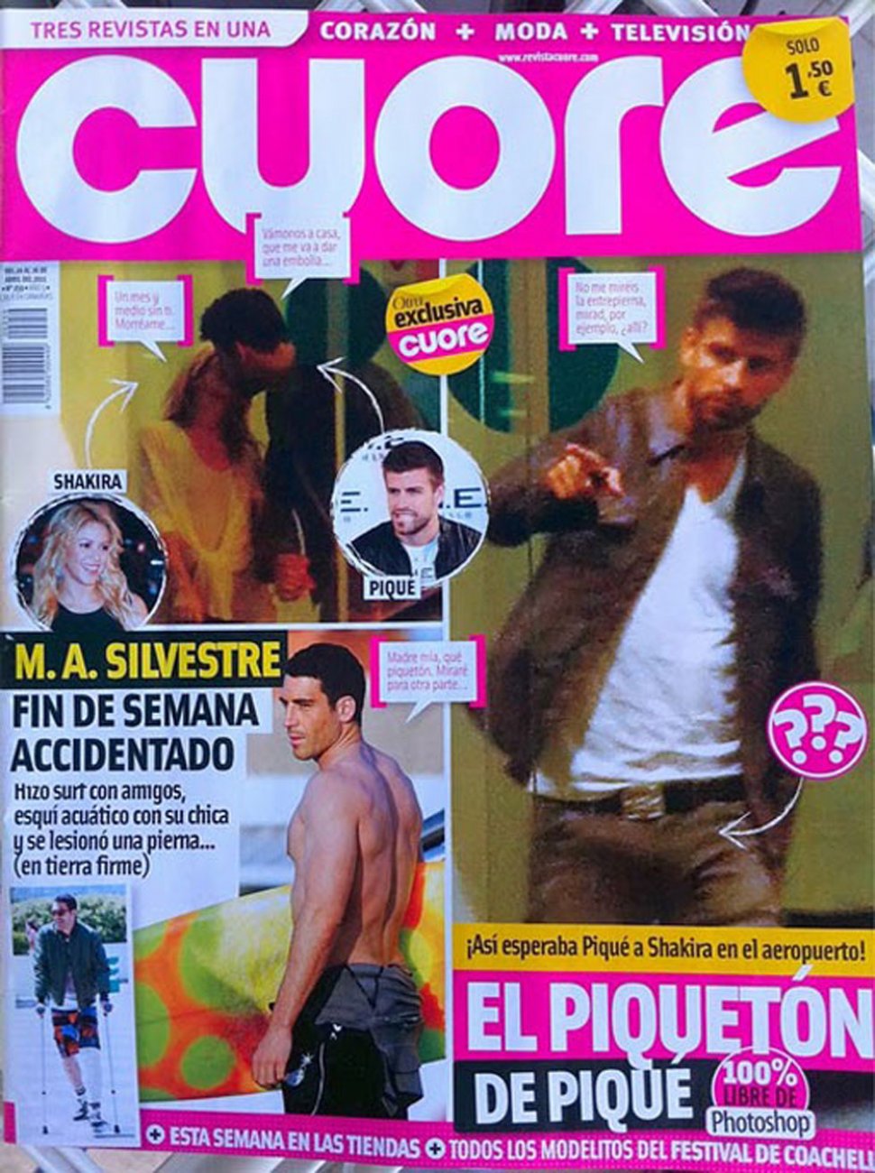 La revista "Cuore" publicó en su tapa una foto en la que se ve al futbolista esperando a la colombiana en el aeropuerto y luego la pareja junta. Hasta ahí todo normal, de no ser por la "emoción" que reflejó Piqué en sus pantalones. La imagen -más que elocuente- ha despertado todo tipo de comentarios y eso se reflejó en Twitter, donde "#piqueton" se convirtió en el tema más comentado de España, informó el diario "El Mundo".