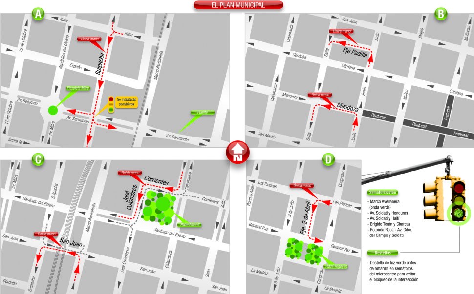 6) La doble mano en Corrientes al 1.000 (gráfico C), la cuadra de la estación del ferrocarril, permitirá a quienes conducen por Catamarca girar a la derecha para salir velozmente hacia el oeste, evitando la siempre agitada esquina de Catamarca y Santiago.