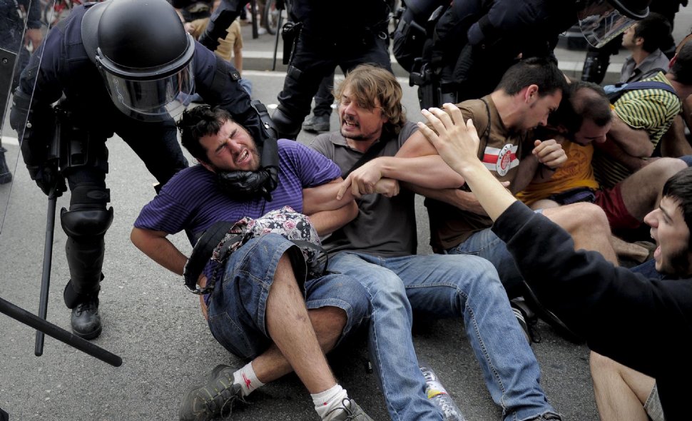 Fue la primera intervención policial desde que se montaron campamentos en todo el país, a partir del pasado 15. Con la excusa de que se debía hacer una limpieza del lugar, las fuerzas de seguridad catalanas cargaron contra los manifestantes. En la violenta refriega se vio a efectivos golpeando, arrastrando y jalando del pelo a los manifestantes. El resultado fue de 121 heridos (diez debieron ser hospitalizados por sus lesiones), entre manifestantes y policías, y dos "indignados" arrestados.