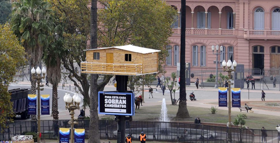 BUENOS AIRES.- Instalaron una vivienda a 12 metros de altura, para concientizar sobre la emergencia habitacional que afecta a muchas ciudades del país. La organización no gubernamental Un Techo para Mi País (Utpmp) inauguró hoy la "Casa en el Aire", por segundo año consecutivo, en la Plaza de Mayo, frente a la Casa Rosada. El lema de la campaña es "Para esta casa sobran candidatos"