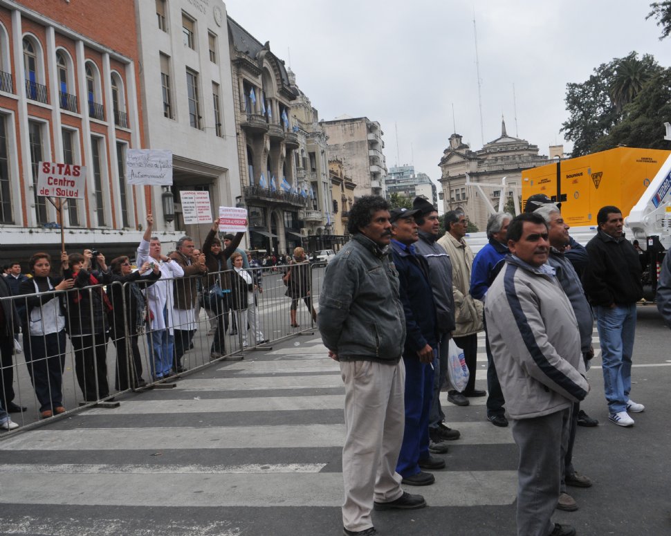 En plaza Independencia, ayer, un grupo de trabajadores de distintos centros asistenciales y CAPS protestó con pancartas durante la mañana. El concurrido acto de la Dirección de Vialidad, que presentó maquinaria pesada para pavimentación en el interior, no amilanó al personal de la salud, que continuó reclamando mejores ingresos a las puertas de la Casa de Gobierno.