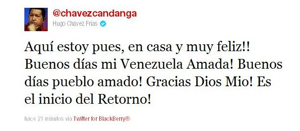@chavezcandanga): "Aquí estoy pues, en casa y muy feliz!! Buenos días mi Venezuela Amada! Buenos días pueblo amado! Gracias Dios Mio! Es el inicio del Retorno!".(Reuters)