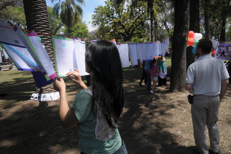 "Hasta ahora habíamos realizado ?tendederos literarios? en las peatonales; pero nos pareció importante esta posibilidad de ?democratizar? la literatura en otros espacios", explicó Belén mientras ataba trocitos de lana violeta de los que colgaban microrrelatos. "Uno de nuestros objetivos es acercar la literatura a personas que por padecer ceguera, impedimento motriz o estar hospitalizadas no pueden acceder la lectura convencional... Y esta plaza está muy cerquita del Hospital Padilla", añadió sonriendo con una mezcla de dulzura y entusiasta fortaleza.