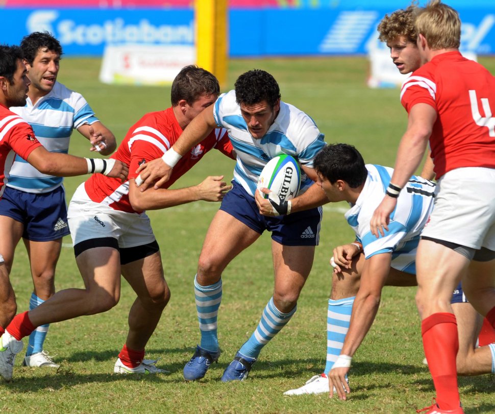ELUDIENDO MARCAS. Francisco Merello intenta superar el tackle canadiense en la final de los Panamericanos. TELAM