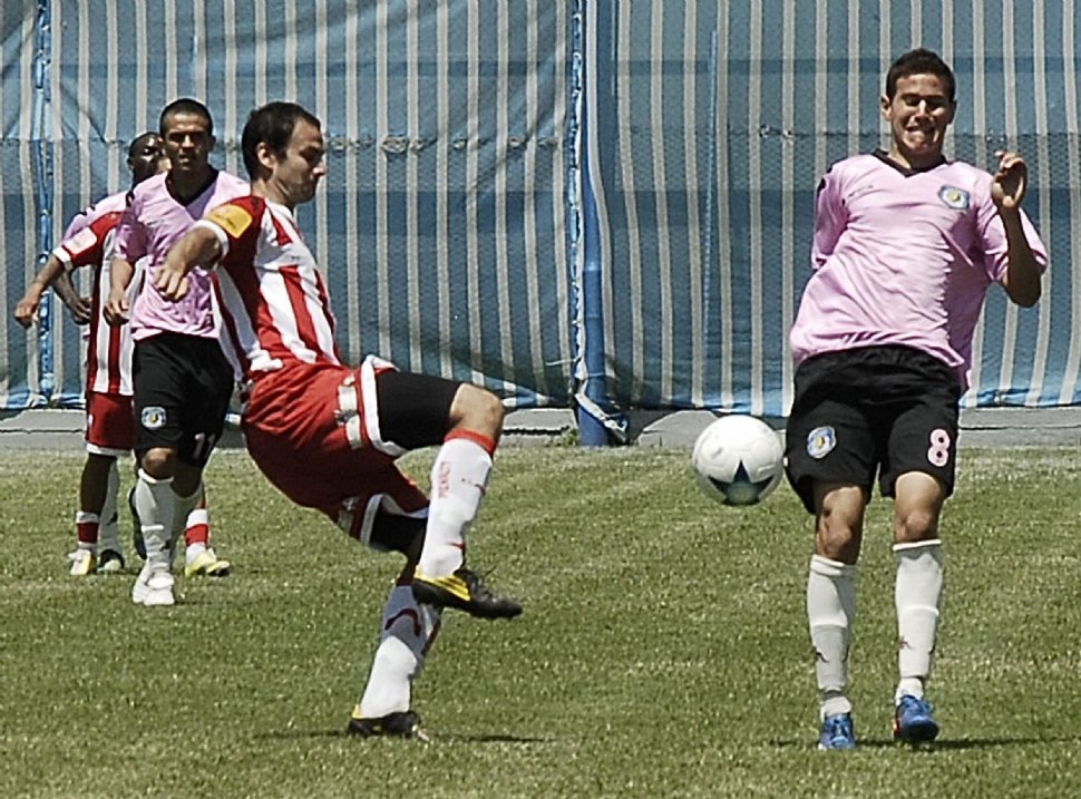 A MATAR O MORIR. Gonzalo Oviedo no se ahorra nada para intentar despejar una pelota ante la presión de Maximiliano Gómez. FOTOBAIRES