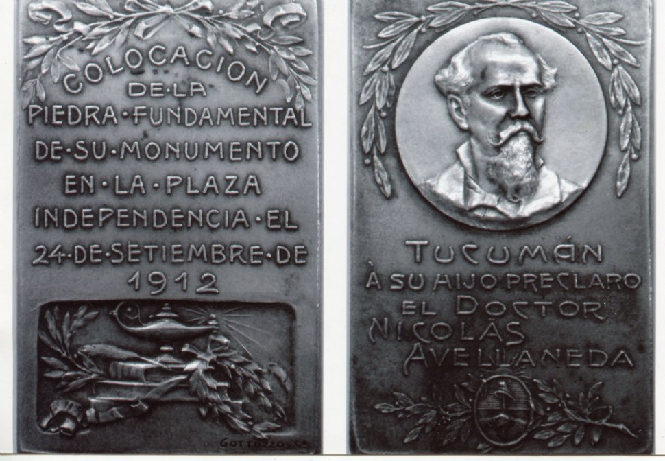 NICOLÁS AVELLANEDA. Plaqueta acuñada en Tucumán, en 1912, para la piedra fundamental del monumento que se proyectaba erigir en la plaza Independencia. LA GACETA / ARCHIVO