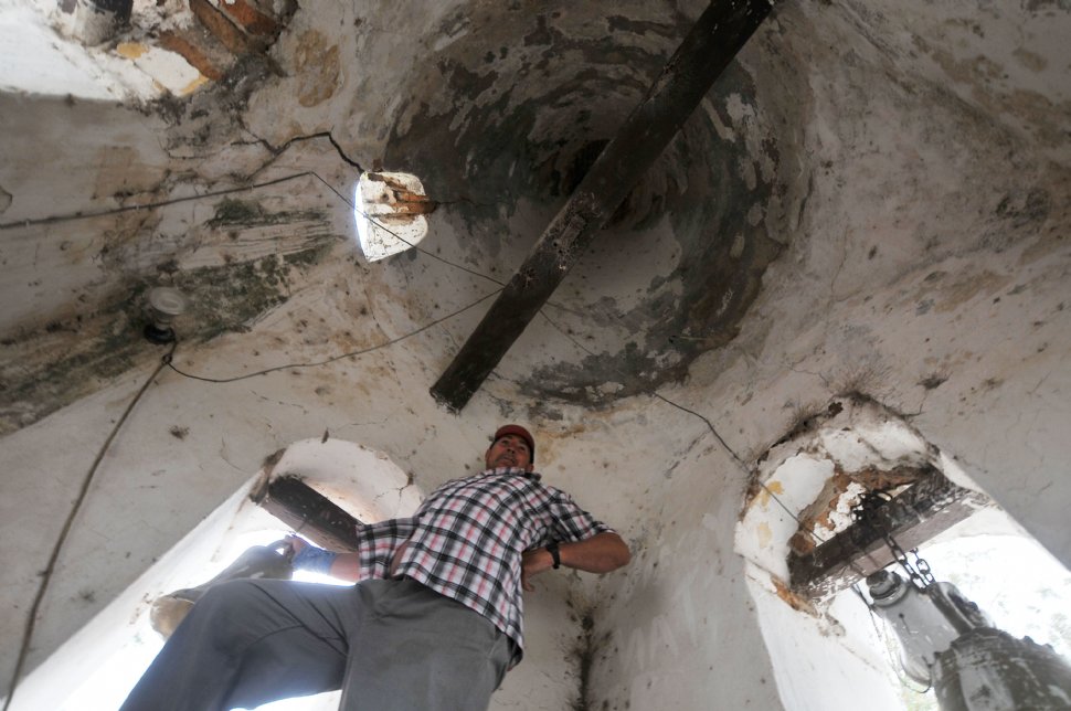 ¿Y AHORA QUÉ HACEMOS? Uno de los vecinos se subió a una escalera y le mostró a LA GACETA el estado en el que se encuentra el histórico campanario de la capilla. Parece a punto de derrumbarse. LA GACETA / FOTO DE OSVALDO RIPOLL
