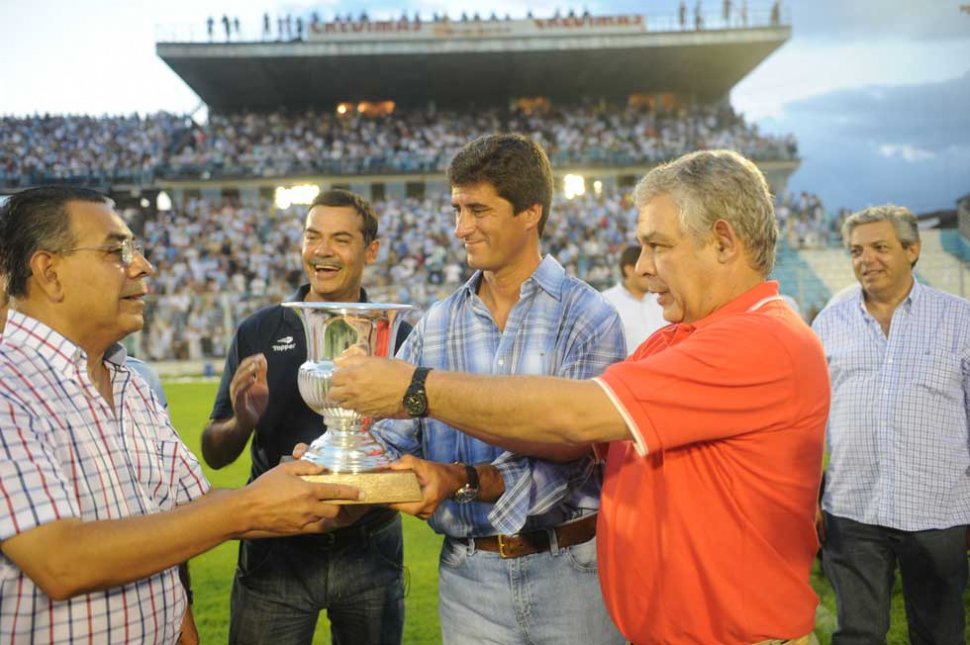TODO PARA EL CAMPEÓN. José Pochat, gerente general de LA GACETA, entrega junto al presidente "santo", Emilio Luque, la Copa al vicepresidente "decano", Luis Narchi en la premiación.
