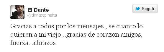 Luis Alberto Spinetta, agradeció hoy el cariño y los mensajes de acompañamiento a la familia por la muerte de uno de los pioneros del rock nacional. "Gracias a todos por los mensajes, sé cuanto lo quieren a mi viejo...gracias de corazón amigos, fuerza...abrazos", escribió en