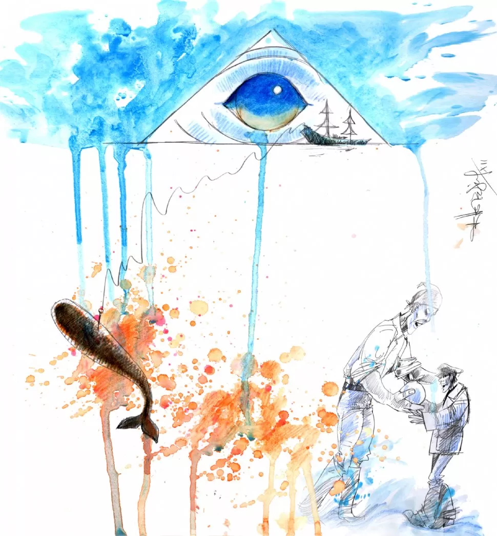 Corrió a su casa con la Biblia en una mano y el paquetito en la otra. Su madre, ocupada en la taberna, le había dejado comida en una ollita. Se sentó en la cama y fue despegando los pliegues de tela hasta darse con la sorpresa. Era el ojo de un cachalote; un perfecto globo blanco surcado por frágiles y zigzagueantes venitas rojas. Del tamaño de un puño. El iris, negro en su homogénea perfección, lo taladraba hasta el corazón.