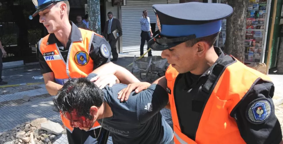 HERIDO Y DETENIDO. Un ex combatiente, que protestaba en la 9 de Julio, es llevado por policías federales. NA