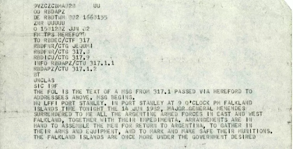 "Los preparativos están en curso a fin de reunir a los hombres para un regreso a Argentina, recoger sus armas y equipos, y marcar y asegurar sus municiones. Las islas Falkland están una vez más bajo el gobierno deseado por sus habitantes. Dios salve a la reina", concluye el télex.