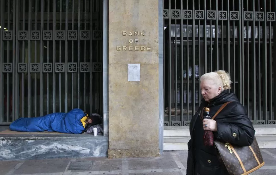 DORMIR EN CUALQUIER LADO. Un hombre utiliza la entrada del Banco de Grecia como improvisada cama. La miseria se extiende en el castigado país. REUTERS DORMIR EN CUALQUIER LADO. Un hombre utiliza la entrada del Banco de Grecia como improvisada cama. La miseria se extiende en el castigado país. REUTERS