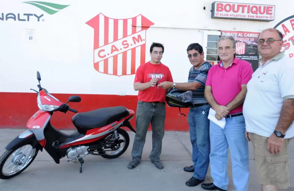 Guillermo Ignacio Coronel retiró la moto que ganó durante el partido que San Martín disputó en La Ciudadela con Tiro Federal. El hincha del "santo" recibió el premio de manos de Pedro Romero, tesorero de los "albirrojos". César Palacios, presidente del complejo; Daniel Kristal, nuevo gerente; y César Juárez, vocero del departamento prensa, también estuvieron presentes. Franco Sánchez, otro simpatizante de San Martín, obtuvo una orden de compra de $500 de Supermercados Emilio Luque.
