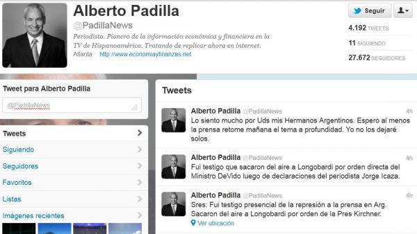 Padilla, luego escribió dos mensajes más en Twitter. El primero: "Fui testigo de que sacaron del aire a Longobardi por orden directa del Ministro De Vido, luego de declaraciones del periodista Jorge Icaza".