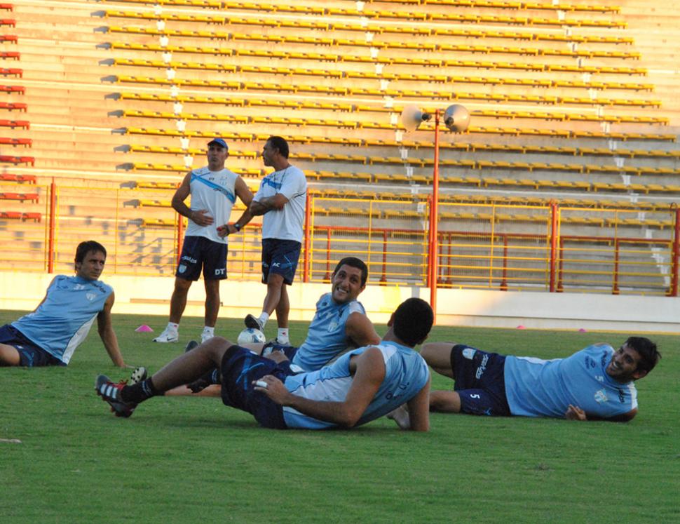 RELAJADOS. Barrado, Mosset y Longo, con la mirada de Llop y Gabrich, se distienden tras la práctica del plantel en el estadio de Sarmiento, en Resistencia. FOTO DE MIGUEL VALENZUELA (ESPECIAL PARA LA GACETA)