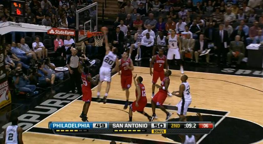 SAN ANTONIO, Estados Unidos.- El escolta argentino Emanuel Ginóbili dejó a todo al AT&T Center de pie luego de una tremenda volcada con la que cerró el segundo cuarto del partido que San Antonio Spurs se llevaría ante Philadelphia 76ers. El bahiense dejó a cuatro jugadores en el camino para terminar enterrando la pelota a falta de segundos para que termine la primera mitad del juego.