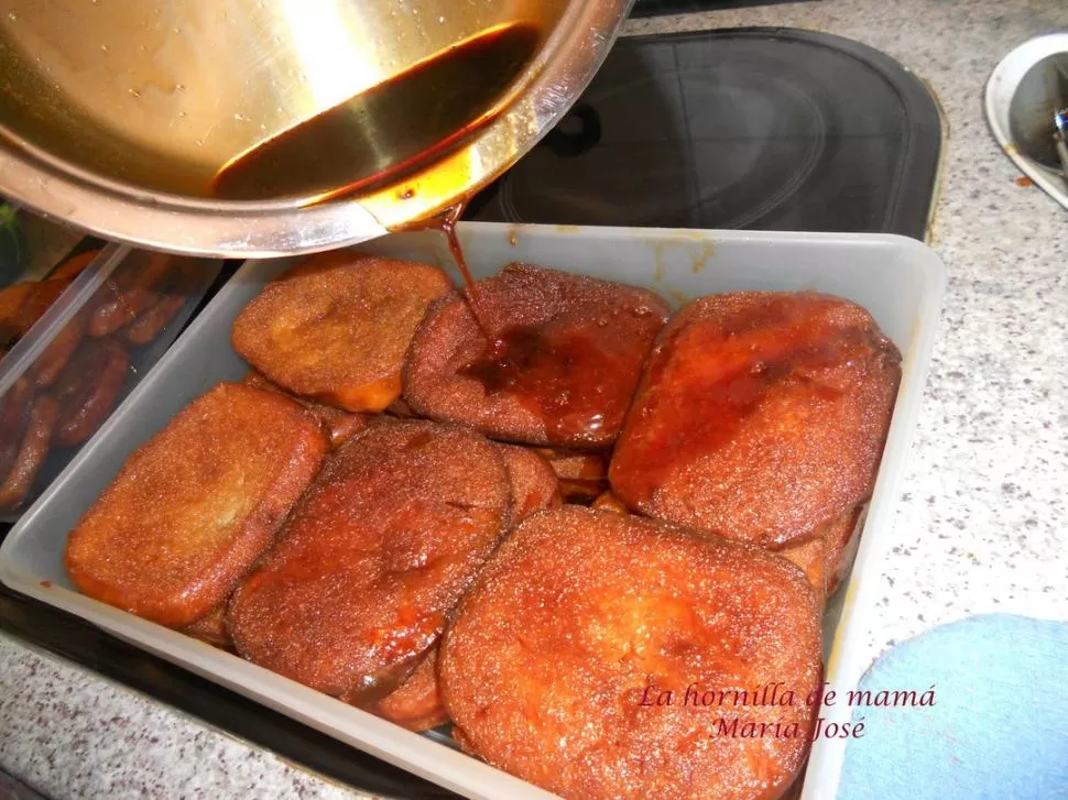 Con las torrijas pasa como con las empanadas: cada ama de casa tiene su propia versión. Aquí te ofrecemos algunas variantes. Poné en un plato hondo leche, cáscara de limón y una rama de canela (hay quienes reemplazan la leche por vino blanco) y dejá reposar una hora. Mientras, cortá en rebanadas de 1,5 cm -aproximadamente- un pan de molde de ayer (para hacerlo más fácil, podés usar el lactal que viene cortado, pero no es lo mismo). Pasá una cara del pan por la leche; luego empapalo en huevo batido y freílo en aceite de oliva bien caliente. Dejá sobre papel absorbente. Aparte poné en una cacerolita 3/4 partes de miel y una de agua; cuando hierva, sacala del fuego y bañá con ella las torrijas, que habrás colocado en una fuente plana.