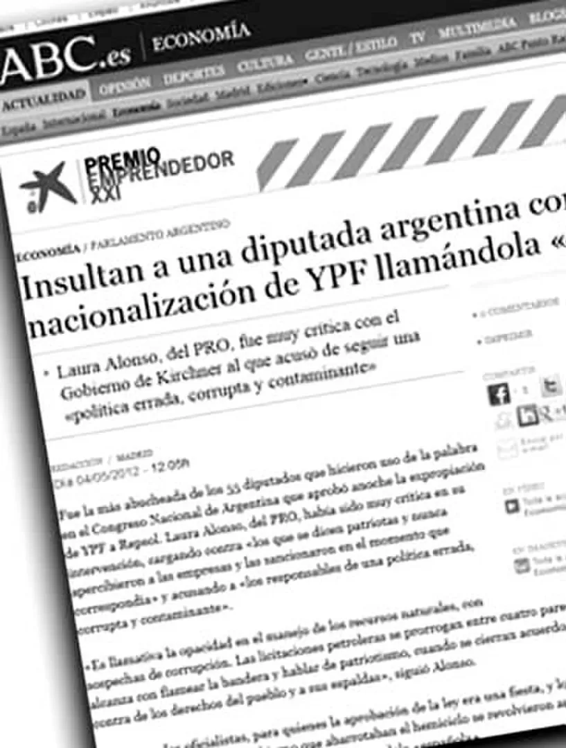 BUENOS AIRES.- Los medios españoles dieron amplia cobertura a la decisión del Congreso de aprobar la ley que expropia las acciones de Repsol en YPF, y, además de centrarse en los cruces que protagonizó en el recinto la diputada del PRO Laura Alonso, volvieron a calificar de "expolio" la medida. "El Congreso argentino ratifica el expolio de YPF", consignó el diario madrileño "ABC", que además hizo hincapié en que "llaman 'española' a una diputada contraria a la nacionalización de YPF". "El País" subrayó el "respaldo absoluto de los diputados argentinos a la expropiación de YPF", y remarcó que la ley aprobada por 208 votos a favor, 32 en contra y cinco abstenciones "consigue en el Congreso el mayor apoyo que ha logrado un proyecto durante los nueve años de gobierno kirchnerista". "Expansión" reportó: "la aprobación de la iniciativa gubernamental dio paso a una auténtica fiesta entre el oficialismo en el recinto del Congreso, abarrotado con invitados de organizaciones afines, mientras en las puertas del recinto cientos de militantes celebraron la decisión". "El Mundo" enfatizó que la sanción se logró "tras dos días de aburridos monólogos en vez de debate". (DyN)