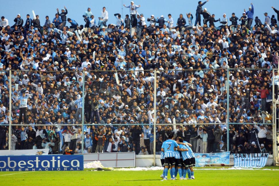 MAREA HUMANA. Los jugadores celebran el primer gol ante la tribuna abarrotada de calle Chile. ARCHIVO LA GACETA / FOTO DE INES QUINTEROS ORIO