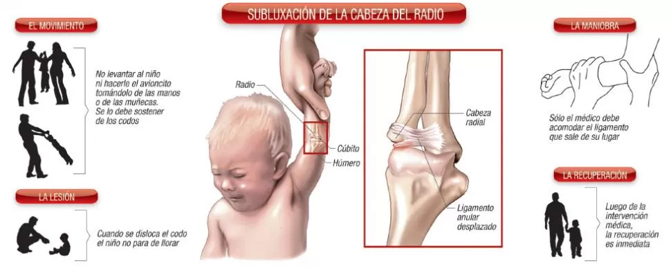 "Los padres deben tener sumo cuidado cuando le hagan el avioncito a sus hijos: lo correcto es tomarlos o alzarlos desde los codos. Jamás de la muñeca y con el codo extendido, ya que la tracción en esta posición suele derivar en la subluxación de la cabeza del radio (cuando este hueso se corre del lugar donde se une con la articulación del codo)", detalló el especialista. - Además del avioncito; ¿qué otro movimiento puede generar la dislocación del codo?