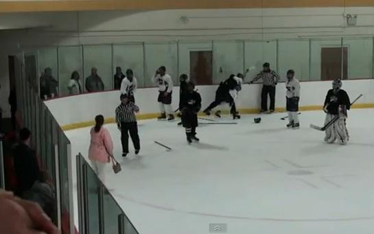 En el video, que fue publicado en YouTube, muestra a la mujer, que llevaba una chaqueta de color rosa y sin soltar el bolso, correr por el hielo con su dedo apuntando a gritar a los jugadores y árbitros para disolver la pelea.