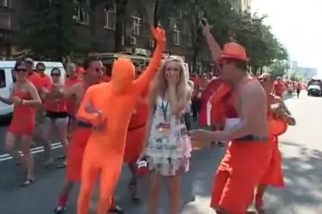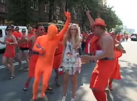 KHARKIV, Ucrania.- Miles de hinchas holandeses concentraron su energía en fastidiar a una reportera ucraniana que se disponía a dar un flash informativo, desde una de las calles céntricas de una de las cuidades sede del certamen, antes del comienzo del partido que eliminaría a la "Naranja Mecánica" de la Eurocopa 2012.
