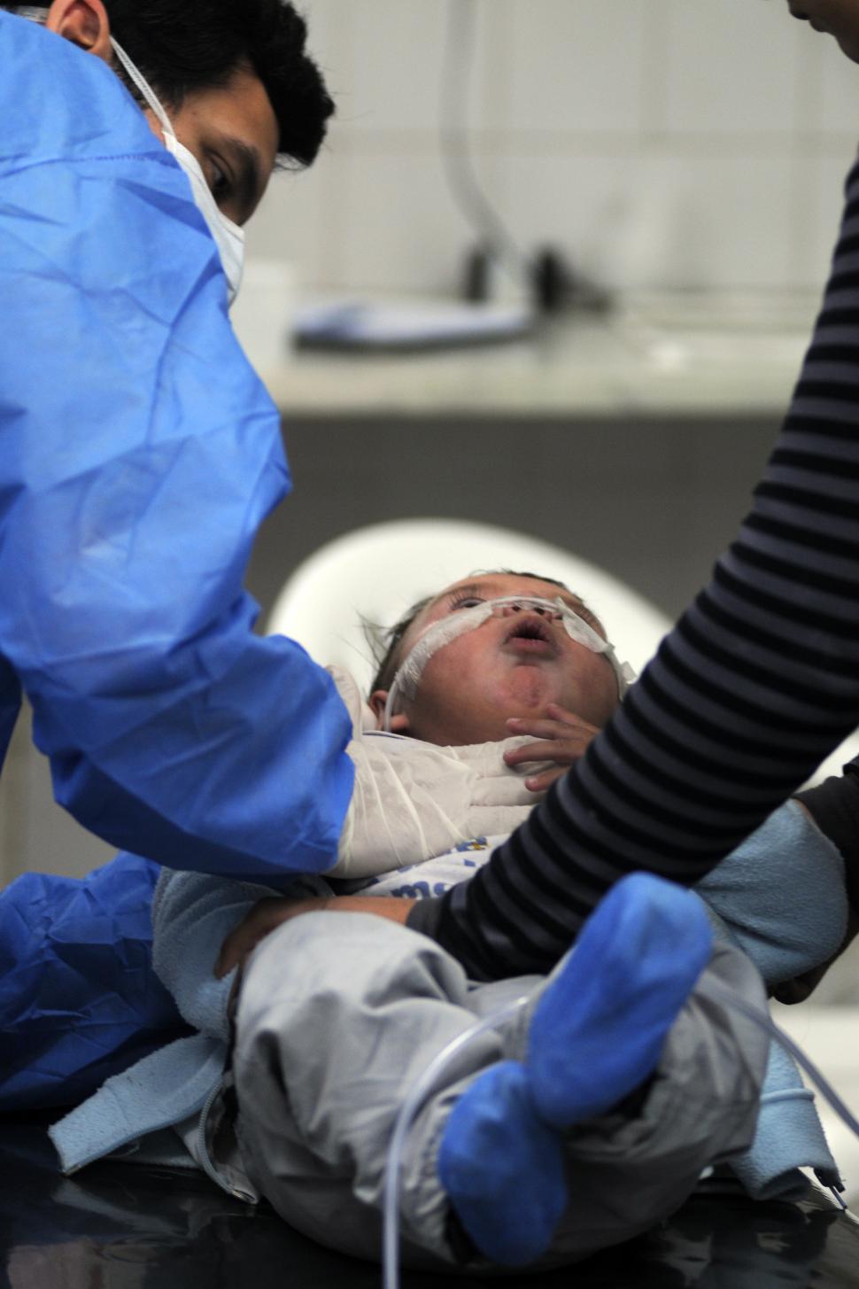 Con el torso desnudo por la fiebre y a upa de su mamá, Fabricio respiraba con una máscara de oxígeno. Desde chico sufre un cuadro alérgico, por lo que en esta época es muy frecuente que se le obstruya la respiración. "Estaba muy agitado y tenía tos, le costaba dormir y ahora está con fiebre", contó la mamá, Silvina Campero.