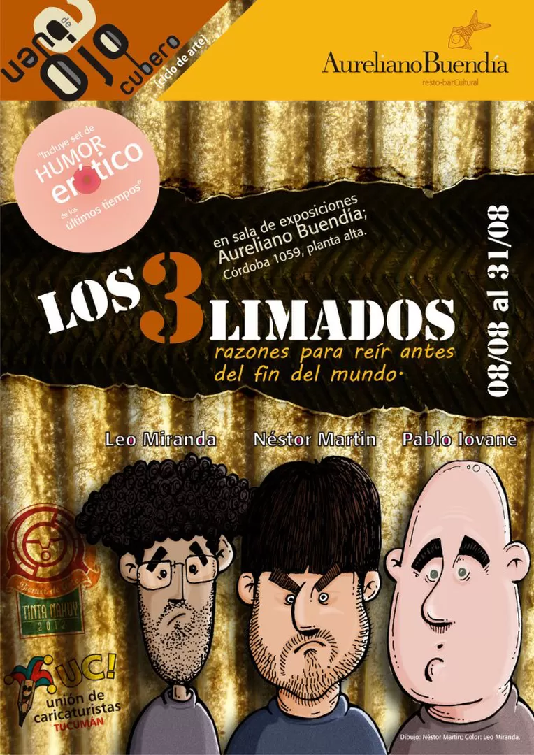 El grupo de humor gráfico "Los 3 Limados", integrado por Leo Miranda, Néstor Martín y Pablo Iovane, presenta la muestra de humor erótico titulada "Razones para reír antes del fin del mundo". La exposición se puede visitar a partir de las 21 en la sala Aureliano Buendía (Córdoba 1.059) y está auspiciada por la Unión de Caricaturistas (UC) y la Unión de Historietistas en Ilustradores de Tucumán (Unhil), en el marco de la Bienal de Arte Tinta Nakuy 2012.