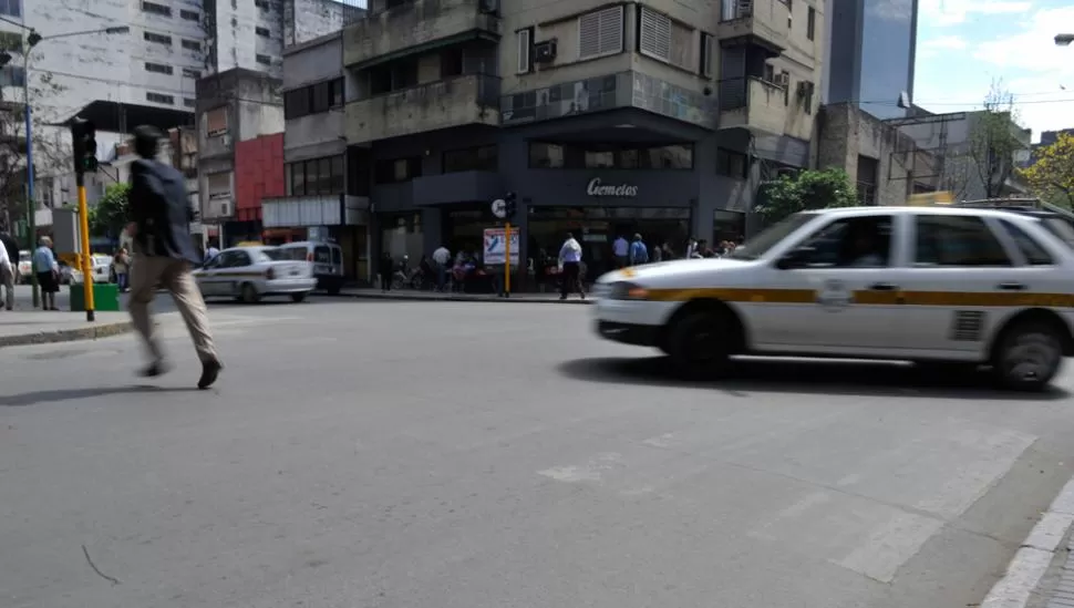¿Y SI APRENDEMOS DE UNA VEZ? El peatón corre para evitar que el taxi se lo lleve por delante en San Martín y Salta; en realidad, el conductor debería frenar y dejar que el transeúnte camine tranquilo sobre la senda peatonal.
