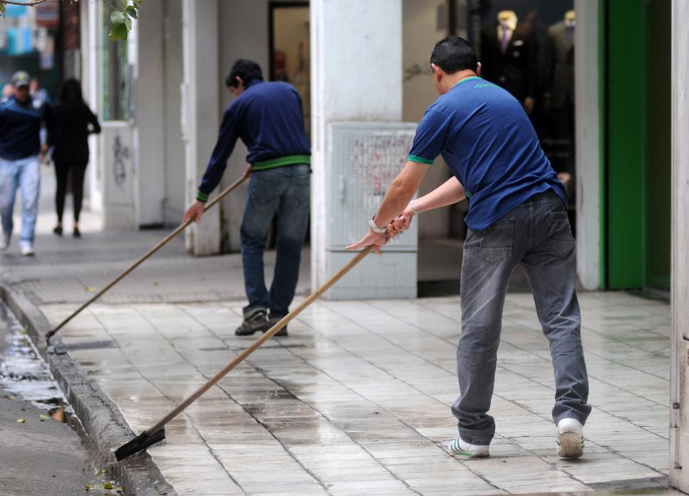 SOLITARIOS. Dos empleados de un comercio limpian la vereda para enfrentar al feriado. LA GACETA / FOTO DE INES QUINTEROS ORIO