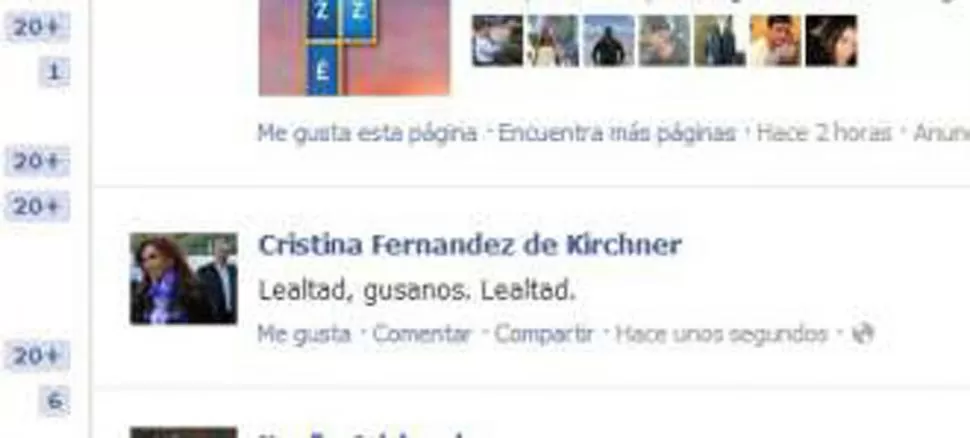 "Lealtad, gusanos".- Un inusual mensaje apareció en la cuenta oficial de la presidenta, Cristina Fernández, en la red social Facebook (foto). A las 23.06 del 16 de octubre, minutos antes de iniciar el Día de la Lealtad Peronista, se leyó: "Lealtad, gusanos. Lealtad". El mensaje apareció y luego de dos minutos de reloj fue eliminado de la cuenta. Pero algunos cibernautas que alcanzaron a observarlo, polemizaron sobre él. En el Gobierno, nadie sabe qué pasó. Pudo tratarse de un hackeo a la cuenta de la mandataria. O quizás se trató de un error de la jefa de Estado al querer enviar un mensaje de texto a un destinatario único. O, simplemente, fue una "metida de pata" de alguno de los administradores de la cuenta. Tampoco se sabe si el mensaje estaba destinado a los díscolos del Gobierno o a los funcionarios de la propia gestión kirchnerista, en caso de un eventual hackeo. (NA)