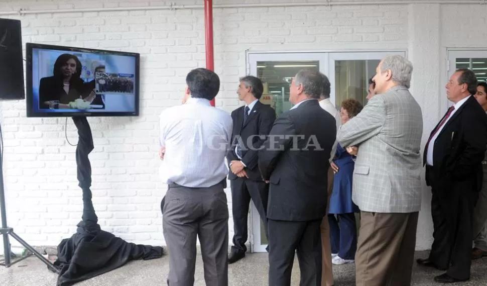La presidenta Cristina Fernández mantuvo este mediodía una videoconferencia con el gobernador, José Alperovich, el gerente y los empleados de la firma ABB, de Bella Vista, en la inauguración una nueva línea productiva. Se trata de la primera activida oficial de la jefa de Estado, luego de su reposo de 24 horas por un cuadro de hipotensión.