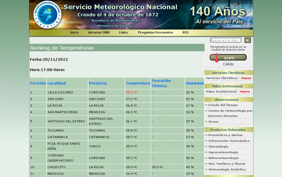 En primer lugar del "ranking del calor" se ubicó Córdoba, que alcanzó los 38.2º, la siguió San Juan, con 37.2º, La Rioja, con 36.8º, Mendoza con 36.3º y Santiago del Estero con 36.1º. Después del top five, está Tucumán, que alrededor de las 18 alcanzó una sensación térmica de 38.6º, según el SMN.