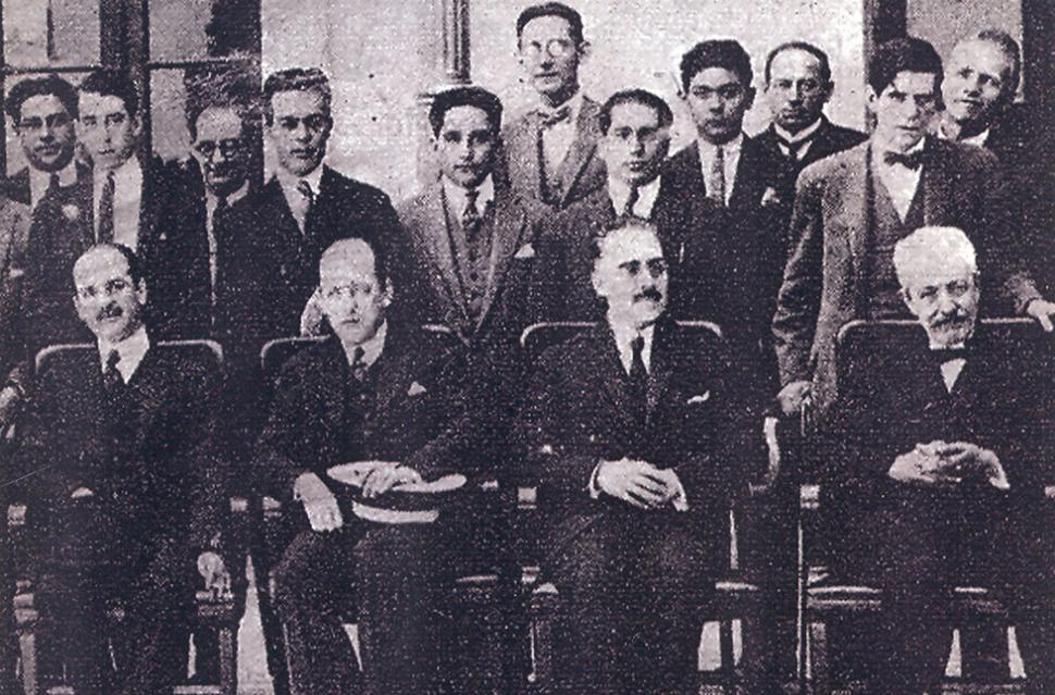 APERTURA DE CLASES EN LA UNT, 1925. Desde la izquierda, el rector, Juan B. Terán; el ministro de Gobierno, Ricardo Bascary; el presidente de la Corte, Manuel Páez de la Torre; y el sabio Miguel Lillo. LA GACETA / ARCHIVO