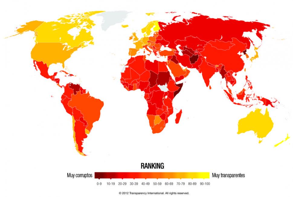 La mayor parte de países latinoamericanos siguen anclados en el piso del Índice de Percepción de la Corrupción 2012, accesible desde ayer en www.transparency.org/cpi2012/results. El relevamiento alcanzó a 176 países, que fueron calificados en una escala del 0 (muy corrupto) al 100 (muy transparente).