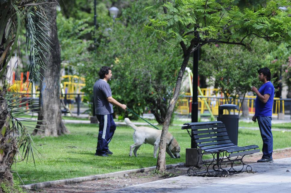 POR EL CÉSPED NO. Carlos le habla a un hombre que pasea su perro.