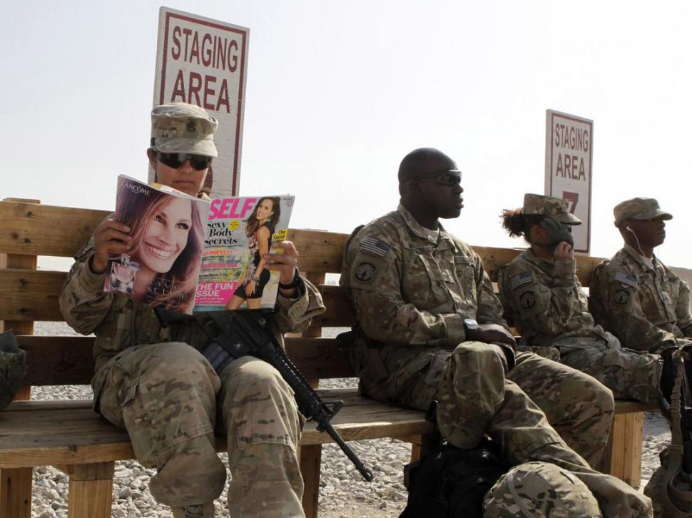 EN ESPERA. Una mujer soldado lee una revista, mientras aguarda un traslado. REUTERS