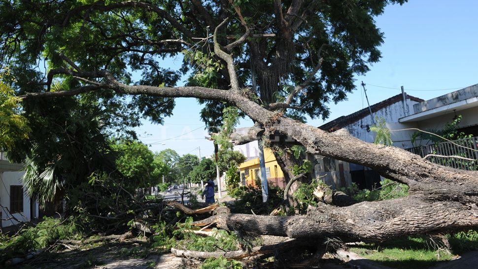 Los fuertes vientos que soplaron ayer en Tucumán derribaron varios árboles y provocaron cortes de luz en distintas zonas de la ciudad. Uno de los ejemplares de mayor tamaño se cayó en Juramento y Celedonio Gutiérrez, en Villa 9 de Julio, donde la Municipalidad trabajaba esta mañana la despejar la zona.