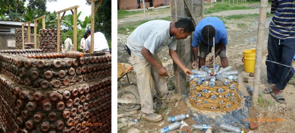 Se trata de transformarlas en ecoladrillos: se las rellena con otros residuos (todo sirve mientras no sea orgánico) o con arena y se las usa para levantar muros (siempre que no sean estructurales), y techos en forma de bóveda. Se colocan a lo ancho y alternadas, para que las paredes queden uniformes: una hilera con la base hacia el frente, la otra, con la tapa, y así sucesivamente. Se pegan igual que los convencionales o los adobes. Para un metro cuadrado de muro se necesitan entre 80 y 100 botellas de 1½ litro. Una vez terminada la pared se la cubre con malla de gallinero y se revoca.