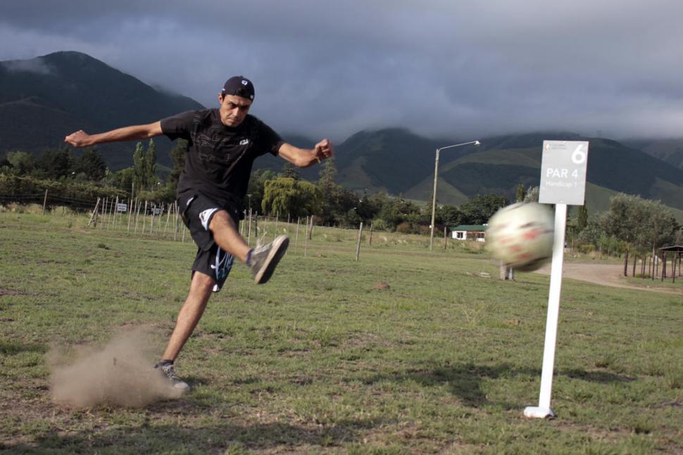 Para practicarlo, sólo hay que saber patear la pelota con un poco de puntería y tener ganas de pasar un rato divertido. El footgolf consiste en introducir -con el pie y en la menor cantidad de golpes posibles- una pelota de fútbol dentro de un hoyo de 52 centímetros de diámetro. El sábado pasado se armaron equipos y partidos en Los Castaños. En el cierre de la jornada estuvo la banda The Melonis.