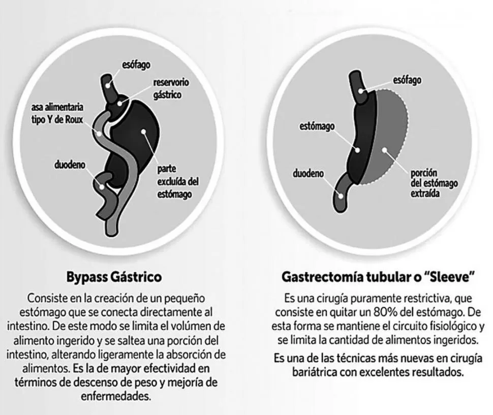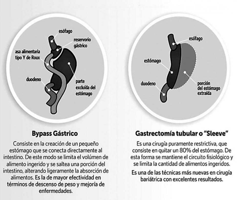 Hay dos técnicas de cirugía bariátrica: el bypass gástrico y la gastrectomía tubular. La opción por una o por otra dependerá del grado de sobrepeso y de las enfermedades asociadas con la obesidad que presenta el paciente.