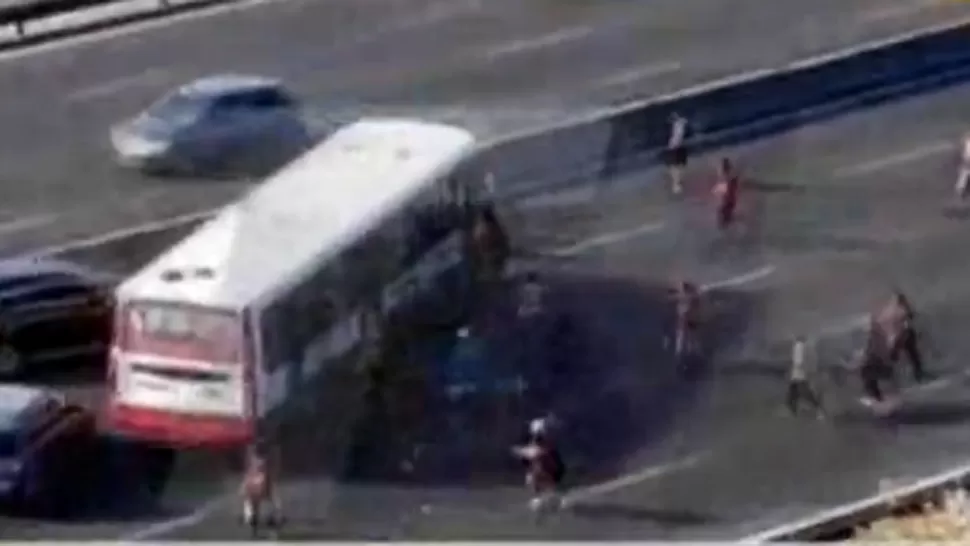 SALVAJADA. Los violentos pararon un colectivo de línea en la autopista y atacaron a los hinchas de River. CAPTURA DE VIDEO