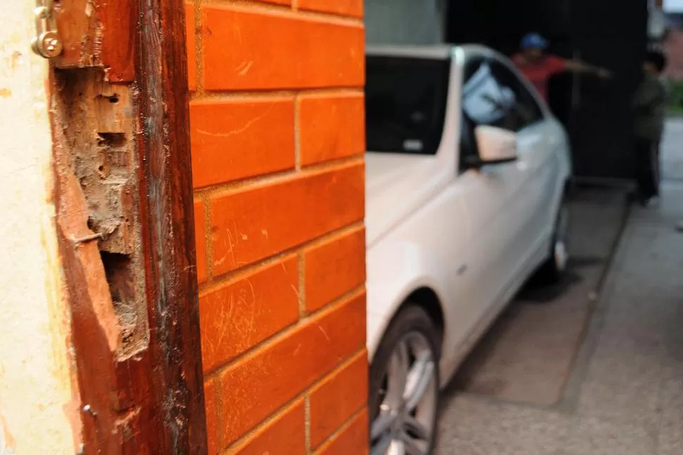 EL GARAGE Y EL JARDÍN. La bala dejó marcas en la pared y las manchas de sangre en el piso revelaron la magnitud del ataque que sufrió una familia. LA GACETA / FOTOS DE DIEGO ARAOZ