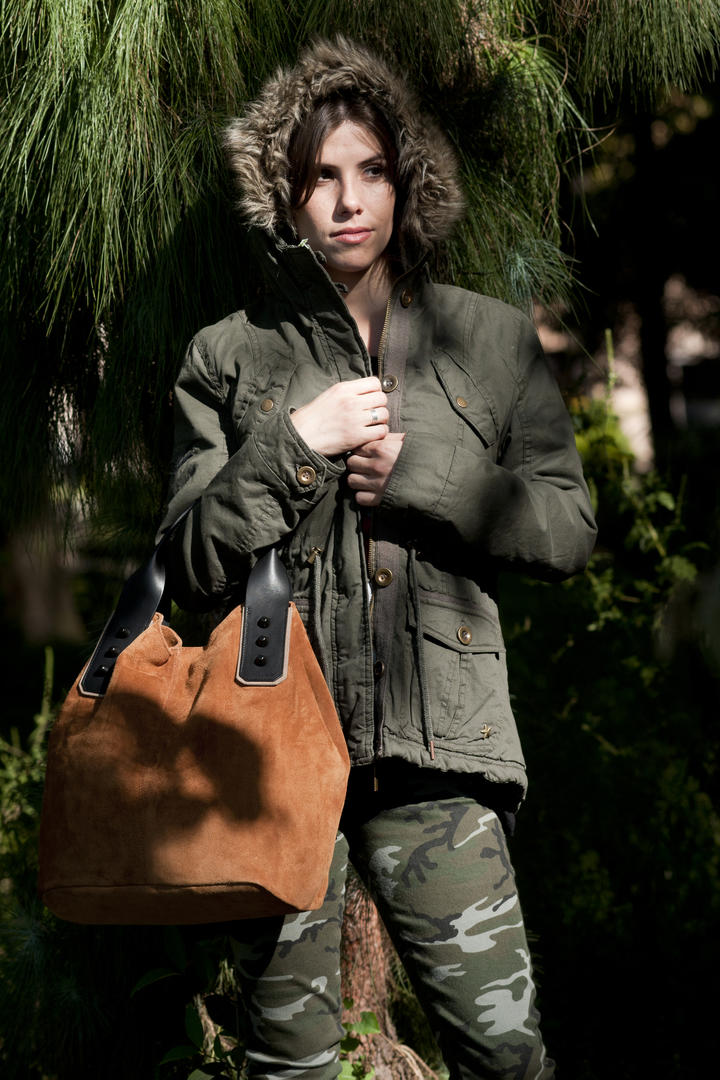 ESTILO MILITAR. Campera con capucha y piel, pantalón camuflado($1100 y $479, MUAA) y Cartera de gamuza con cuero ($949,PRUNE)