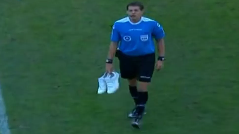 EN LA MANO. Delfino recogió y entregó a la policía el par lanzado desde la tribuna. CAPTURA DE VIDEO EN LA MANO. Delfino recogió y entregó a la policía el par lanzado desde la tribuna. CAPTURA DE VIDEO