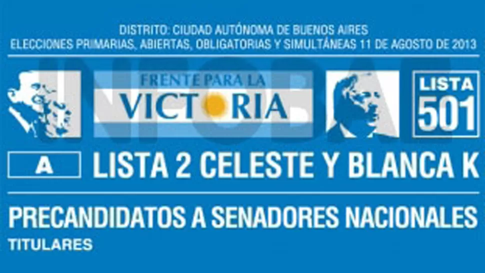 Según algunas fuentes, se especuló con que el oficialismo intentaría incluir en sus boletas la imagen de Cristina Fernández de Kirchner para nacionalizar la elección legislativa, pero finalmente se optó por la imagen del ex presidente de la Nación. Como en 2011, la papeleta del Frente para la Victoria volverá a contar con una pequeña imagen de Juan Domingo Perón y Eva Duarte en su margen superior izquierdo. A la derecha, habrá por primera vez un logo con la cara del ex mandatario, fallecido el 27 de octubre de 2010.