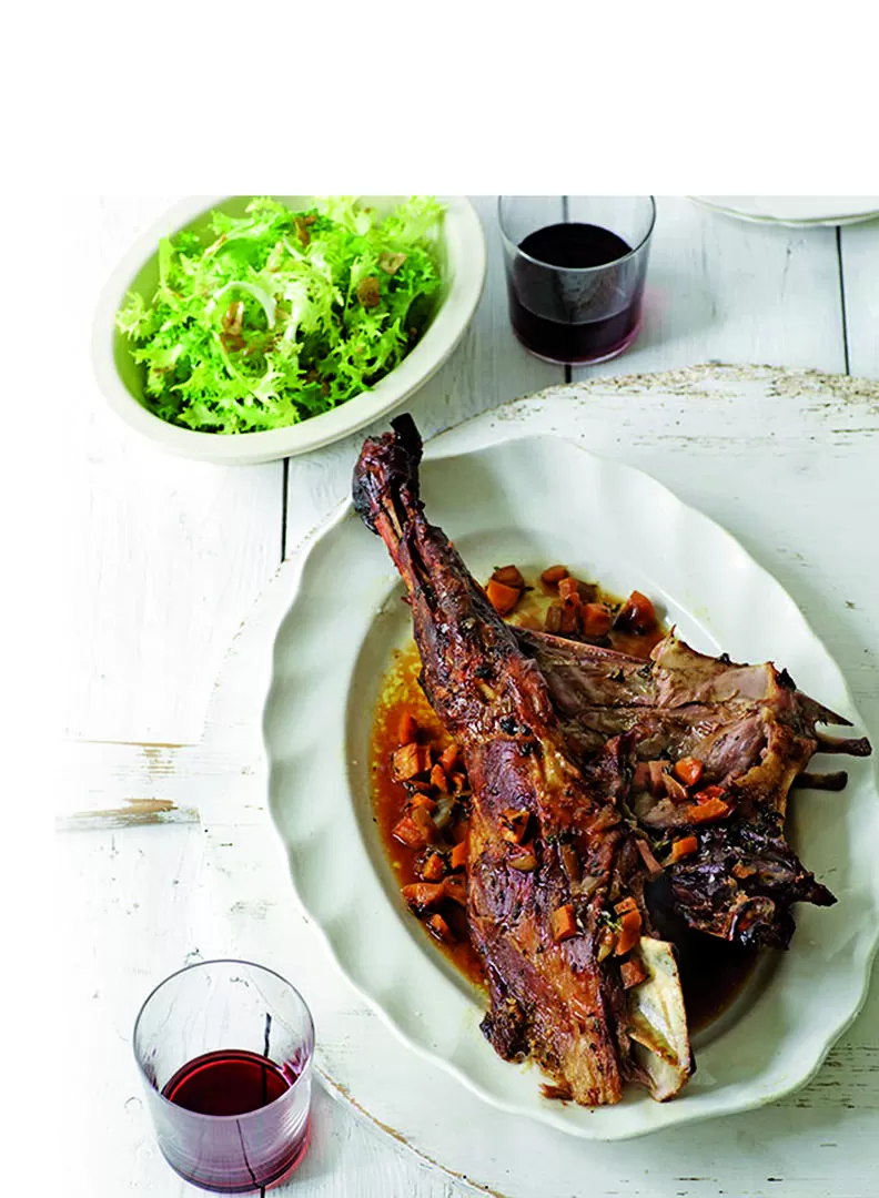 Preparación: Cortá las verduras en forma de cubos pequeños. Luego doralas en aceite en una sartén grande (tipo bowl). Una vez que están tiernas agregá la pierna de chivito. Dejá sellar la carne. Agregá el tomate y unos minutos después, el vino. Dejá cocinar durante unos 15 minutos. Por otra parte, pelá medio kilo de papas y cocinalas al horno con un poco de aceite y unos dientes de ajo. Serví en platos playos, con perejil fresco por encima.